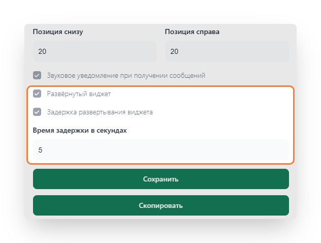 Новая настройка появилась в интеграции чат-бота с сайтом. Опция «Задержка развертывание виджета» появляется только в том случае, если активирована опция «Развернутый виджет». Позволяет добавить паузу перед открытием виджета, когда пользователь переходит на страницу сайта.