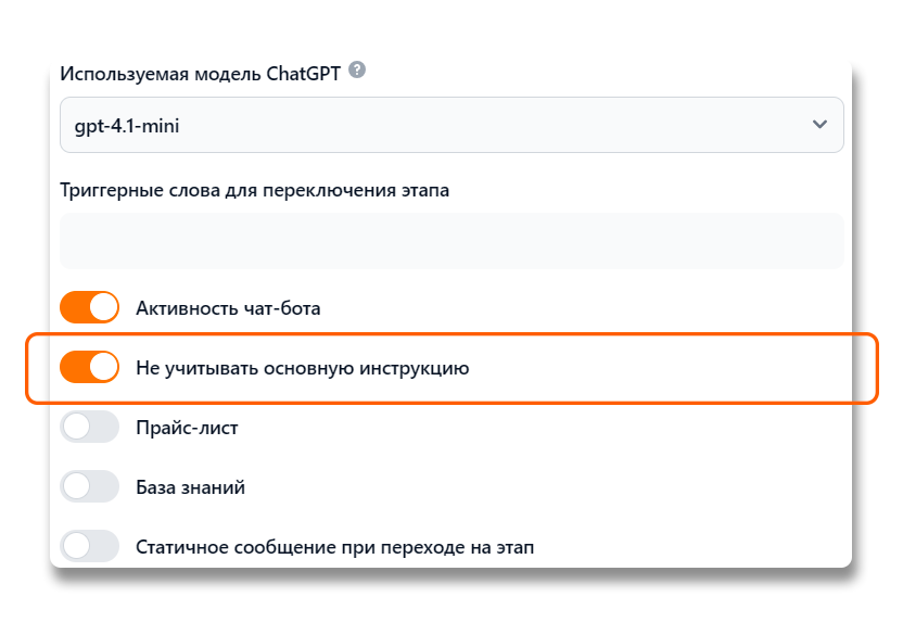 В настройках Этапов появилась дополнительная опция «Не учитывать основную инструкцию». Это подходит в тех случаях, когда вам нужно изменить роль чат-бота. Например, с консультанта на менеджера.