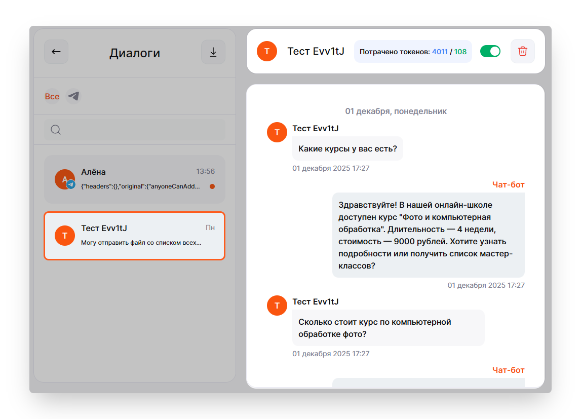 Ознакомиться с результатами тестирования чат-бота в режиме реального времени можно в панели диалогов.